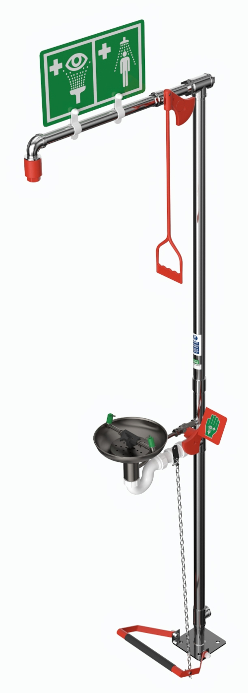 La douche est activée par une tirette reliée à une vanne à ouverture permanente en acier inoxydable 316. Le rince-yeux, équipé d’une vasque en inox, est activé par une plaque poussoir. À l’activation, les capuchons protecteurs des diffuseurs sont automatiquement expulsés par la pression de l’eau.