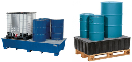 Palette de rétention en acier pour le stockage de liquides inflammables et/ou de polluants des cours d’eau tels que l’huile, vernis ... ou en polyéthylène pour le stockage des substances corrosives.