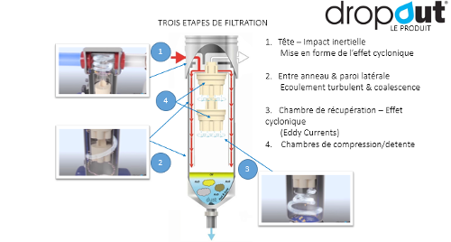 La technologie DROPOUT est une solution unique en 3 étapes successives qui certifie l’élimination des liquides (eau, huile, …) et des particules solides dans l’air (gaz) comprimé.