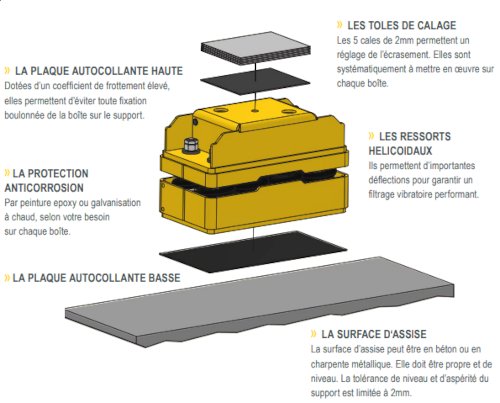 Lorsque les nuisances vibratoires et acoustiques générées par le trafic ferroviaire, routier ou le voisinage industriel sont jugées inacceptables pour l’utilisation d’un bâtiment, il est possible, lors de la conception, de désolidariser globalement les structures concernées. Cette désolidarisation consiste à appuyer la superstructure du bâtiment sur l’infrastructure par le seul intermédiaire de boîtes à ressorts. Sous la charge de la superstructure, les ressorts des boîtes s’écrasent, ce qui permet d’obtenir le fitrage souhaité. En fonction des charges à chaque appui, une boîte de la gamme SU-P avec la raideur adéquate est installée, de sorte à obtenir un écrasement homogène sur l’ensemble des points d’appui de la superstructure.