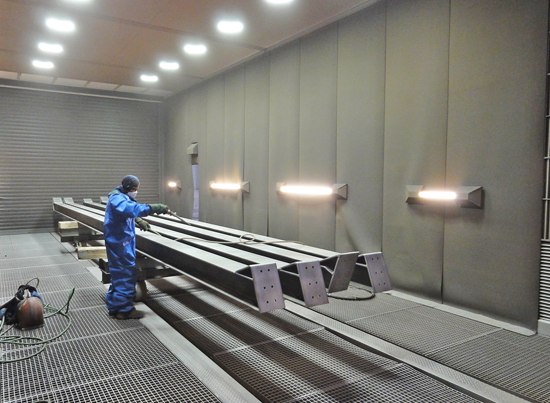 Nous disposons de 1700 m2 d’ateliers couverts, avec 2 hall de séchage et une capacité de levage jusqu’à 90 tonnes. Nous appliquons les peintures à l’aide de pistolets pneumatiques et pistolets airless.